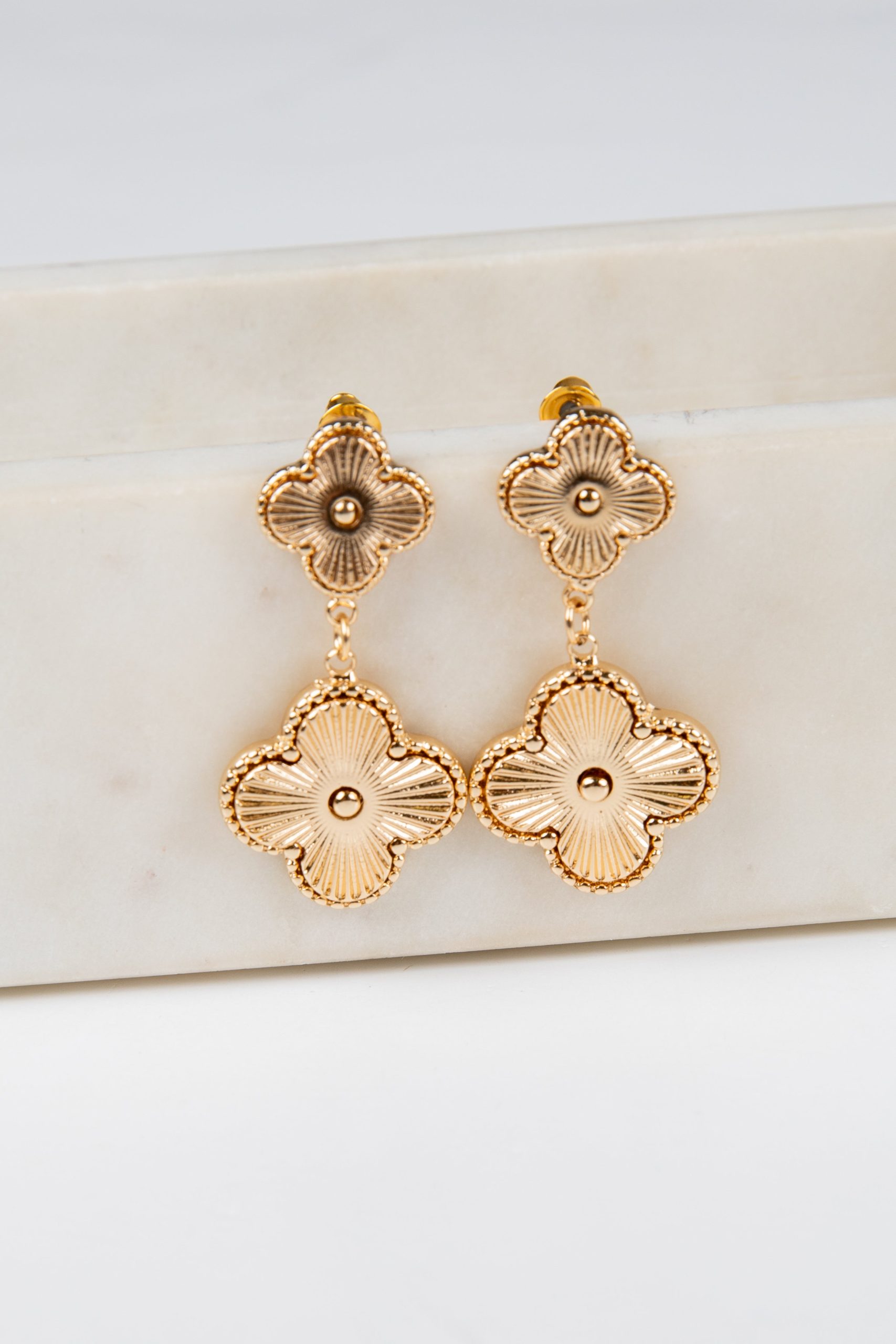 Designed for RSVP-worthy ensembles and picture-perfect moments, the Charlie Gold Quatrefoil Drop Earrings catch the light at every angle! These cute earrings feature a stud post back with quatrefoils! Style the Charlie Earrings with any outfit for an elevated look! Gold Plated Quatrefoil Shape Stud Post BackOne Size | Length 1.25″